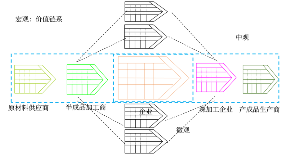 價(jià)值鏈模型的三個(gè)層次:微觀(guān)、中觀(guān)和宏觀(guān)。