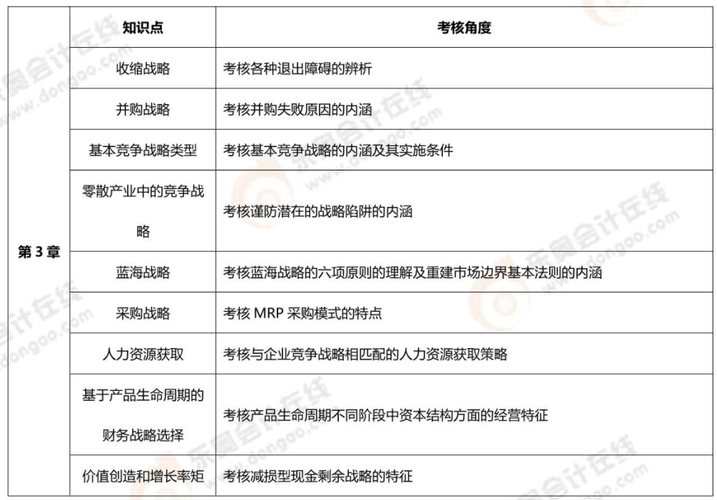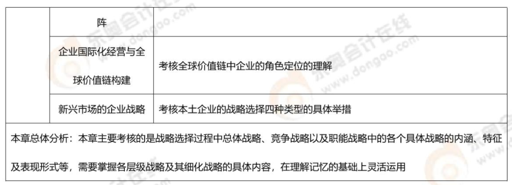 本章高頻考點主要集中在總體戰(zhàn)略部分下的發(fā)展戰(zhàn)略、發(fā)展戰(zhàn)略的主要途徑、收縮戰(zhàn)略,業(yè)務(wù)單位戰(zhàn)略部分下的基本競爭戰(zhàn)略、中小企業(yè)競爭戰(zhàn)略、藍海戰(zhàn)略,職能戰(zhàn)略部分下的市場營銷戰(zhàn)略、研究與開發(fā)戰(zhàn)略、生產(chǎn)運營戰(zhàn)略、采購戰(zhàn)略等,國際化經(jīng)營戰(zhàn)略部分下的企業(yè)國際化經(jīng)營動因、全球價值鏈中的企業(yè)國際化經(jīng)營、國際化經(jīng)營的戰(zhàn)略類型,幾乎全章節(jié)都是重點,而且是必定會考查主觀題的章節(jié),務(wù)必準(zhǔn)確掌握!