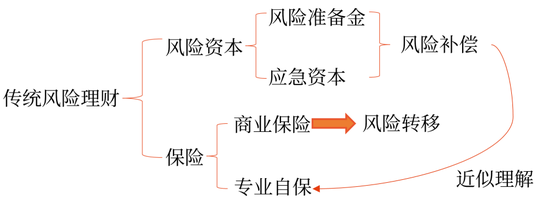 傳統(tǒng)風(fēng)險理財 | ①傳統(tǒng)的風(fēng)險理財是損失理財,即為可能發(fā)生的損失融資,補(bǔ)償風(fēng)險造成的財務(wù)損失,如購買保險。 ②傳統(tǒng)的風(fēng)險理財?shù)哪康氖墙档凸境袚?dān)的風(fēng)險。 |