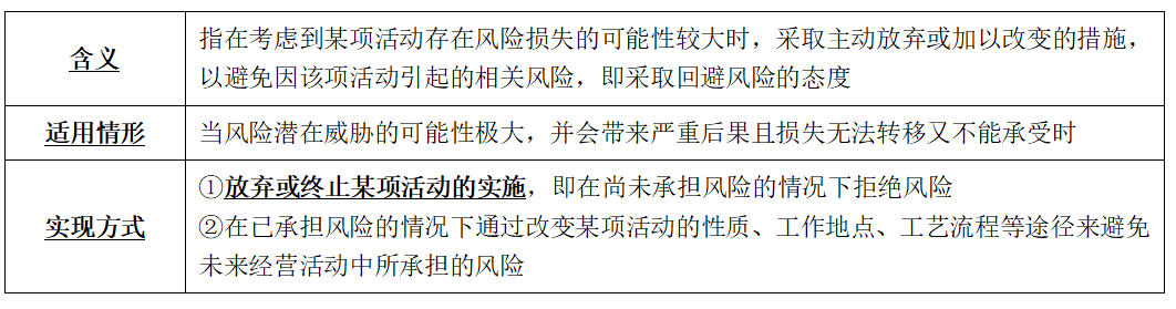 區(qū)分點:通過回避、退出的方式終止與風險的聯(lián)系,使風險發(fā)生的可能性降為零。