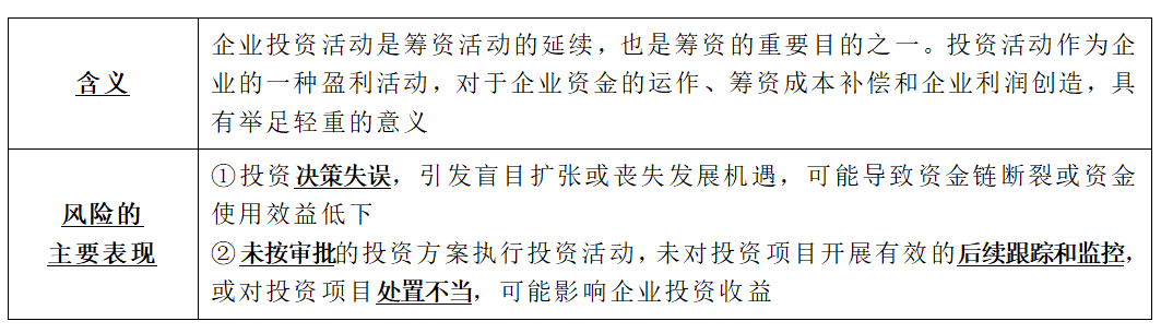 企業(yè)應(yīng)對(duì)投資管理風(fēng)險(xiǎn),應(yīng)重點(diǎn)關(guān)注投資方案可行性論證、投資方案決策、投資方案實(shí)施、投資處置與會(huì)計(jì)系統(tǒng)控制等方面的管控措施。