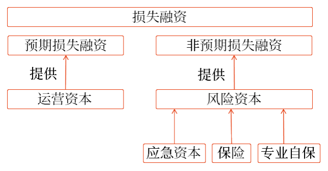 企業(yè)損失分為預(yù)期損失和非預(yù)期損失,因此損失事件融資也相應(yīng)分為預(yù)期損失融資和非預(yù)期損失融資。預(yù)期損失融資一般作為運(yùn)營資本的一部分,非預(yù)期損失融資則屬于風(fēng)險(xiǎn)資本范疇。