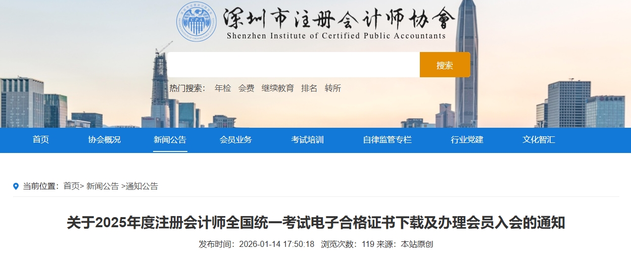 深圳:關(guān)于下載2025年度注冊會計(jì)師考試電子合格證書及辦理會員入會的通知