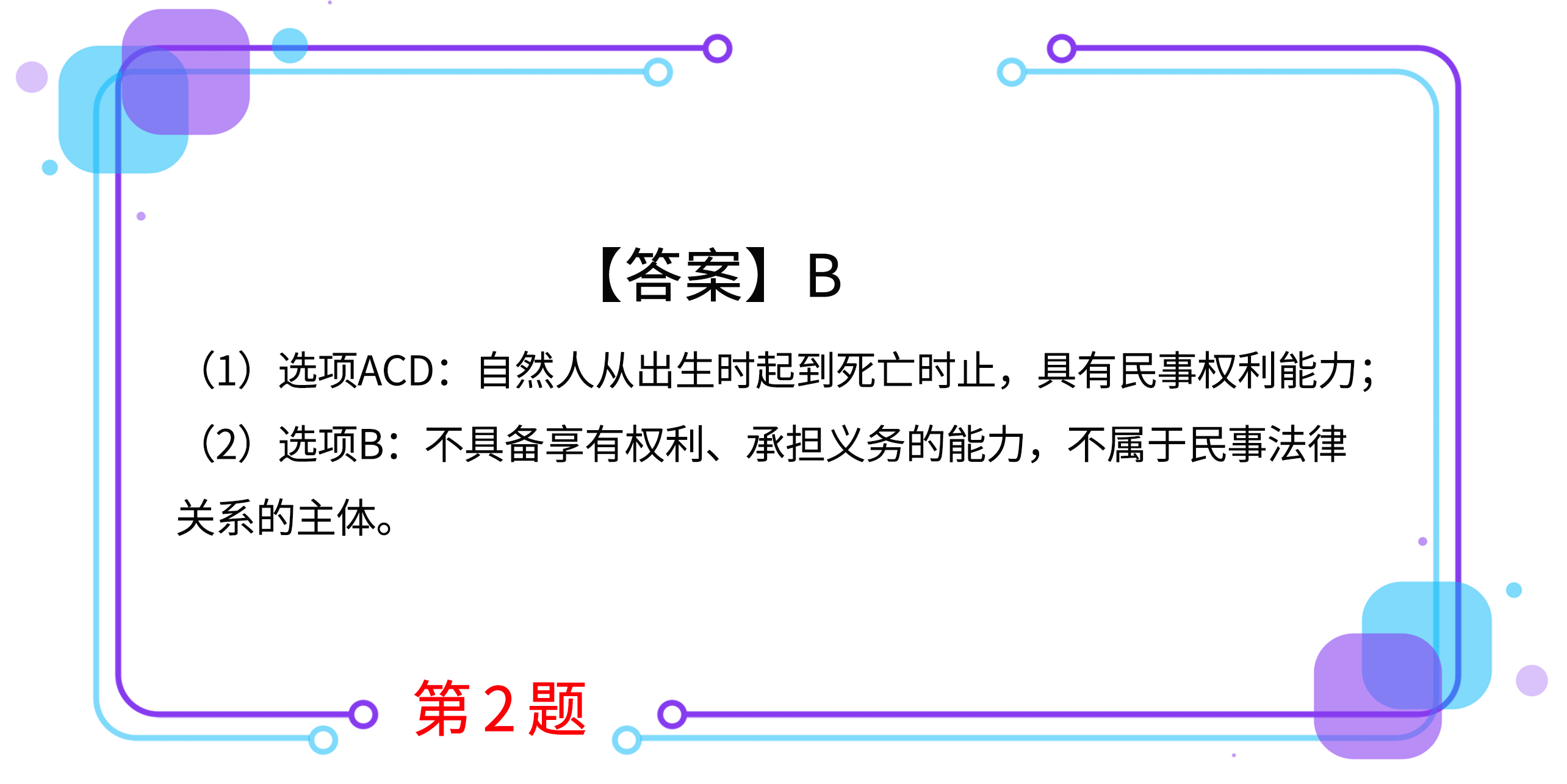 2.根據(jù)民事法律制度的規(guī)定,下列各項(xiàng)中,屬于無民事權(quán)利能力的是( )。(2019年)