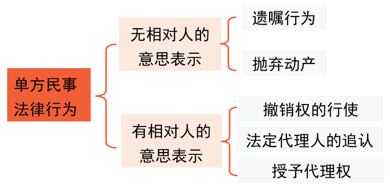 解釋:遺囑行為、拋棄動產(chǎn)等單方民事法律行為,屬于無相對人的意思表示。值得注意的是,并非所有的單方民事法律行為都屬于無相對人的意思表示,如撤銷權(quán)的行使、授予代理權(quán)、法定代理人的追認(rèn)等單方民事法律行為,屬于有相對人的意思表示。