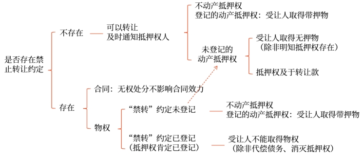 ①如果未登記,受讓人不應(yīng)當(dāng)知道禁止轉(zhuǎn)讓約定的存在,因此,知道或應(yīng)當(dāng)知道抵押權(quán)存在的受讓人取得帶押物、不知道亦不應(yīng)當(dāng)知道抵押權(quán)存在的受讓人取得無押物。