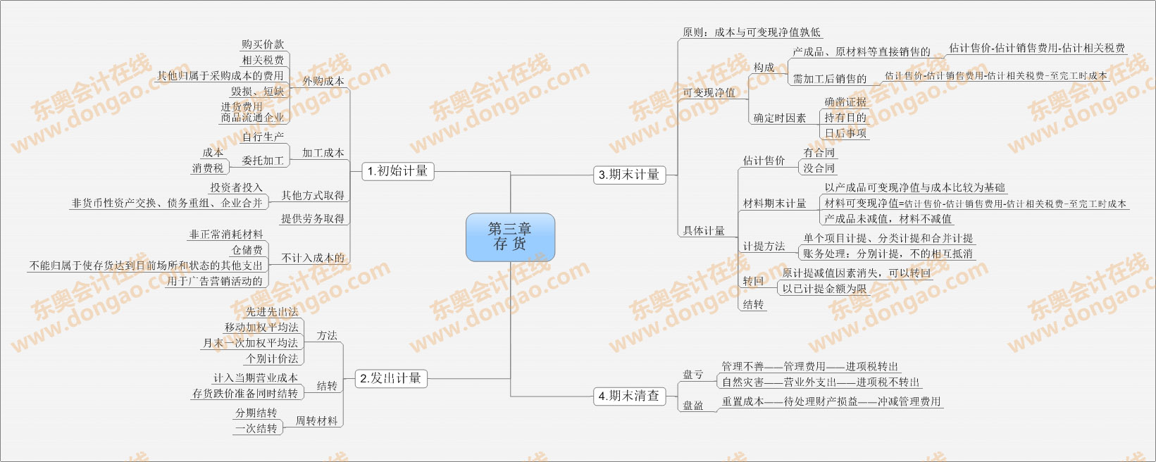 【東奧小編】2014年注冊會計師考試正式進入基礎備考階段,注會知識點繁雜細碎,想要全面掌握注會各科目的知識,需要科學高效的學習方法,思維導圖正是一種非常適合注會復習的學習方法,正確利用思維導圖,不僅能使自己積極進行知識點總結,形成清晰的思路,還能對知識點進行快速查漏補缺。以下是2014注會《會計》第三章存貨思維導圖: