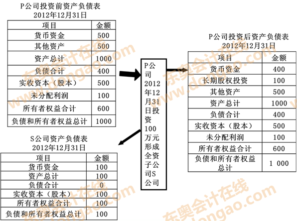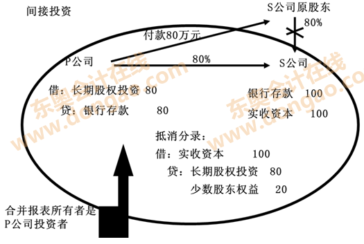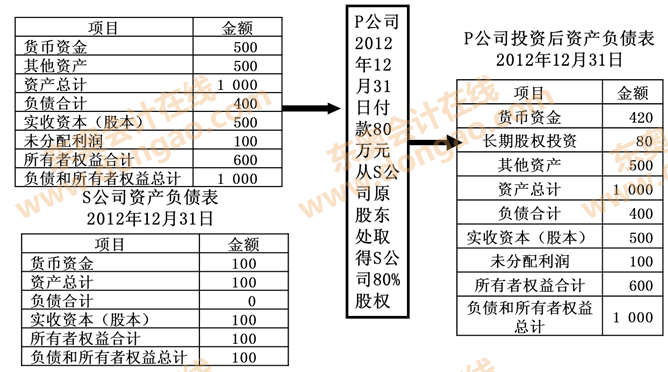 ③P公司投出80萬元貨幣資金取得S公司80%股權(quán),即P公司向S公司原股東支付80萬元貨幣資金,取得S公司原股東擁有的S公司80%股權(quán)。為簡化,假定S公司資產(chǎn)負(fù)債表中只有銀行存款100萬元,實(shí)收資本100萬元。作為企業(yè)集團(tuán)整體,相當(dāng)于用80萬元貨幣資金取得了S公司原有資產(chǎn)和負(fù)債的80%(即凈資產(chǎn)的80%)。在合并財(cái)務(wù)報(bào)表中,S公司的所有資產(chǎn)和負(fù)債都要全額反映,其凈資產(chǎn)的20%歸少數(shù)股東所有。因此,合并財(cái)務(wù)報(bào)表中P公司個(gè)別財(cái)務(wù)報(bào)表中的長期股權(quán)投資和S公司個(gè)別財(cái)務(wù)報(bào)表中的所有者權(quán)益不應(yīng)存在,應(yīng)予抵消,并同時(shí)確認(rèn)少數(shù)股東權(quán)益。