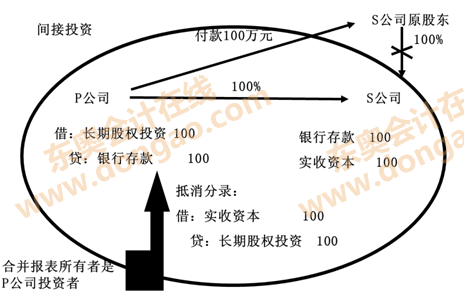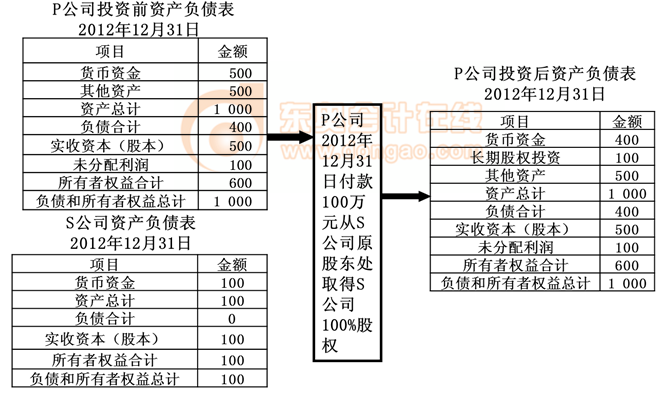 、赑公司投出100萬元貨幣資金取得S公司股權(quán),即P公司向S公司原股東支付100萬元貨幣資金,取得S公司原股東擁有的S公司股權(quán)。為簡化,假定S公司資產(chǎn)負(fù)債表中只有銀行存款100萬元,實(shí)收資本100萬元。作為企業(yè)集團(tuán)整體,相當(dāng)于用100萬元貨幣資金取得了S公司原有的資產(chǎn)和負(fù)債(即凈資產(chǎn)),P公司個(gè)別財(cái)務(wù)報(bào)表中的長期股權(quán)投資和S公司個(gè)別財(cái)務(wù)報(bào)表中的所有者權(quán)益不應(yīng)存在,應(yīng)予抵消。