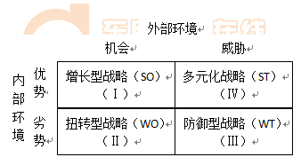2.劣勢——機(jī)會(WO)。扭轉(zhuǎn)型戰(zhàn)略是利用外部機(jī)會來彌補(bǔ)內(nèi)部劣勢,使企業(yè)改劣勢而獲取優(yōu)勢的戰(zhàn)略。存在外部機(jī)會,但由于企業(yè)存在一些內(nèi)部劣勢而妨礙其利用機(jī)會,可采取措施先克服這些劣勢。
