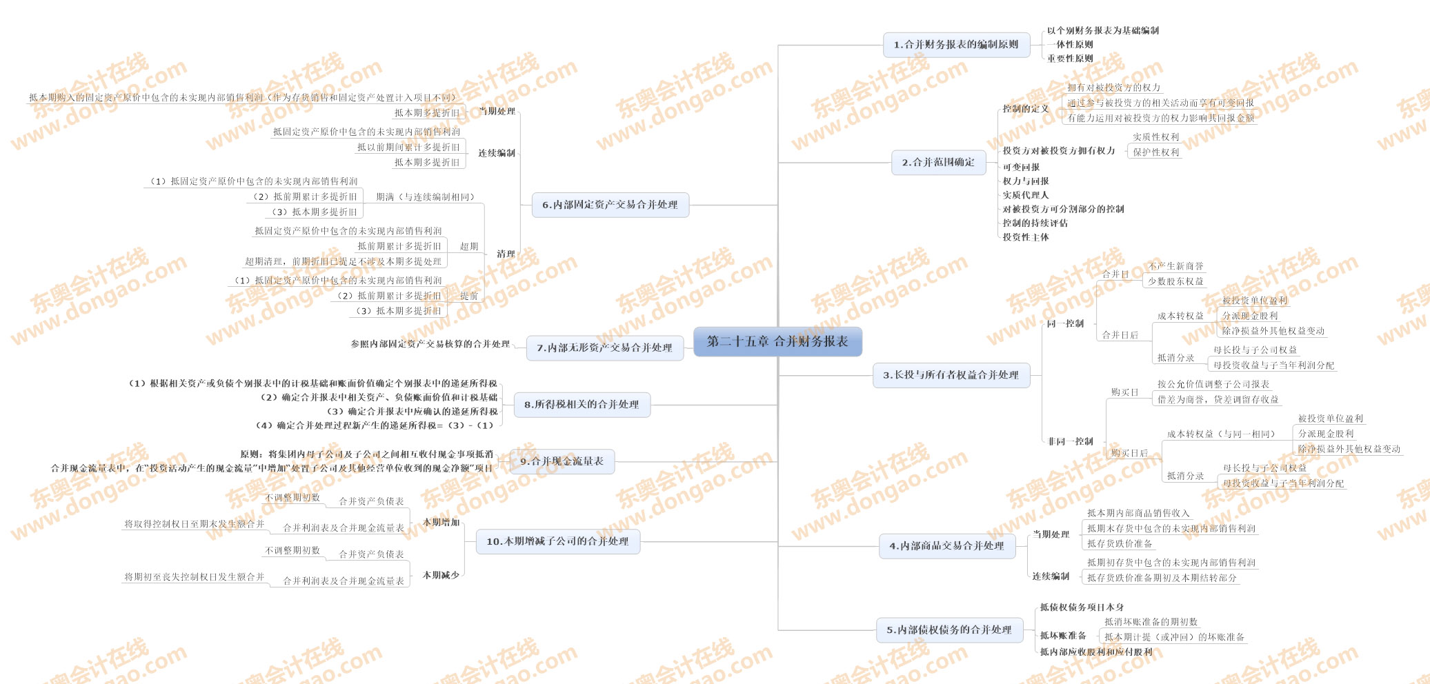 【東奧小編】2014年注冊(cè)會(huì)計(jì)師考試正式進(jìn)入基礎(chǔ)備考階段,注會(huì)知識(shí)點(diǎn)繁雜細(xì)碎,想要全面掌握注會(huì)各科目的知識(shí),需要科學(xué)高效的學(xué)習(xí)方法,思維導(dǎo)圖正是一種非常適合注會(huì)復(fù)習(xí)的學(xué)習(xí)方法,正確利用思維導(dǎo)圖,不僅能使自己積極進(jìn)行知識(shí)點(diǎn)總結(jié),形成清晰的思路,還能對(duì)知識(shí)點(diǎn)進(jìn)行快速查漏補(bǔ)缺。以下是2014注會(huì)《會(huì)計(jì)》第二十五章合并財(cái)務(wù)報(bào)表思維導(dǎo)圖: