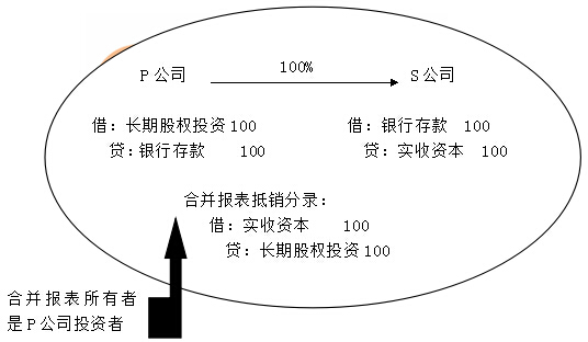 、貾公司投出100萬(wàn)元貨幣資金形成S公司,作為企業(yè)集團(tuán)整體,相當(dāng)于貨幣資金100萬(wàn)元由一個(gè)賬戶(hù)轉(zhuǎn)入另一個(gè)賬戶(hù),P公司個(gè)別財(cái)務(wù)報(bào)表中的長(zhǎng)期股權(quán)投資和S公司個(gè)別財(cái)務(wù)報(bào)表中的實(shí)收資本不應(yīng)存在,應(yīng)予抵消。