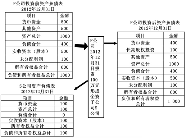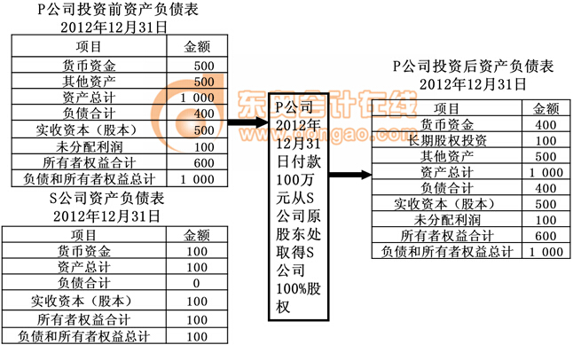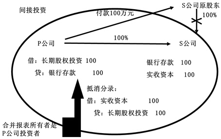 ②P公司投出100萬(wàn)元貨幣資金取得S公司股權(quán),即P公司向S公司原股東支付100萬(wàn)元貨幣資金,取得S公司原股東擁有的S公司股權(quán)。為簡(jiǎn)化,假定S公司資產(chǎn)負(fù)債表中只有銀行存款100萬(wàn)元,實(shí)收資本100萬(wàn)元。作為企業(yè)集團(tuán)整體,相當(dāng)于用100萬(wàn)元貨幣資金取得了S公司原有的資產(chǎn)和負(fù)債(即凈資產(chǎn)),P公司個(gè)別財(cái)務(wù)報(bào)表中的長(zhǎng)期股權(quán)投資和S公司個(gè)別財(cái)務(wù)報(bào)表中的所有者權(quán)益不應(yīng)存在,應(yīng)予抵消。