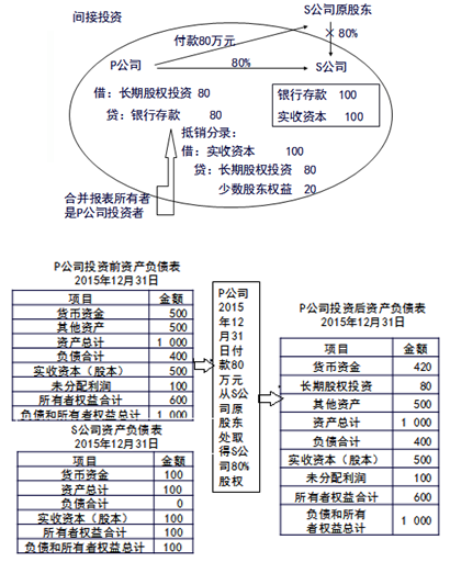、跴公司投出80萬元貨幣資金取得S公司80%股權(quán),即P公司向S公司原股東支付80萬元貨幣資金,取得S公司原股東擁有的S公司80%股權(quán)。為簡化,假定S公司資產(chǎn)負債表中只有銀行存款100萬元,實收資本100萬元。作為企業(yè)集團整體,相當于用80萬元貨幣資金取得了S公司原有資產(chǎn)和負債的80%(即凈資產(chǎn)的80%)。在合并財務(wù)報表中,S公司的所有資產(chǎn)和負債都要全額反映,其凈資產(chǎn)的20%歸少數(shù)股東所有。因此,合并財務(wù)報表中P公司個別財務(wù)報表中的長期股權(quán)投資和S公司個別財務(wù)報表中的所有者權(quán)益不應(yīng)存在,應(yīng)予抵銷,并同時確認少數(shù)股東權(quán)益。圖示如下: