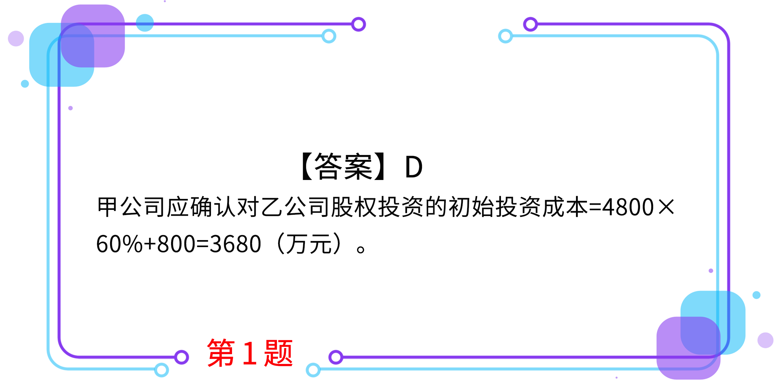 1.甲公司20×3年7月1日自母公司(丁公司)取得乙公司60%股權(quán),當日,乙公司個別財務(wù)報表中凈資產(chǎn)賬面價值為3200萬元。該股權(quán)系丁公司于20×1年6月自公開市場購入,丁公司在購入乙公司60%股權(quán)時確認了800萬元商譽。20×3年7月1日,按丁公司取得該股權(quán)時乙公司可辨認凈資產(chǎn)公允價值為基礎(chǔ)持續(xù)計算的乙公司可辨認凈資產(chǎn)價值為4800萬元。為進行該項交易,甲公司支付有關(guān)審計等中介機構(gòu)費用120萬元。不考慮其他因素,甲公司應(yīng)確認對乙公司股權(quán)投資的初始投資成本是( )。