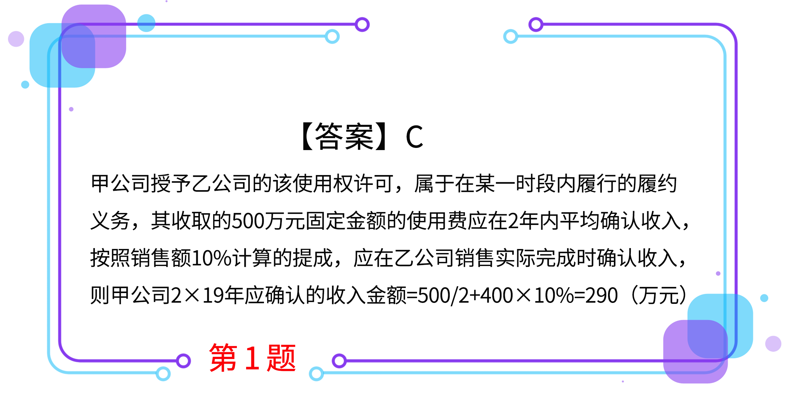 1.甲公司為一家籃球俱樂(lè)部,2×19年1月與乙公司簽訂合同,約定乙公司有權(quán)在未來(lái)兩年內(nèi)在其生產(chǎn)的水杯上使用甲公司球隊(duì)的圖標(biāo),甲公司收取固定使用費(fèi)500萬(wàn)元,以及按照乙公司當(dāng)年銷(xiāo)售額的10%計(jì)算提成。乙公司預(yù)期甲公司會(huì)繼續(xù)參加當(dāng)?shù)芈?lián)賽,并取得優(yōu)異成績(jī)。乙公司在2×19年實(shí)現(xiàn)銷(xiāo)售收入400萬(wàn)元。假定不考慮其他因素,甲公司2×19年應(yīng)確認(rèn)收入的金額為( )萬(wàn)元。
