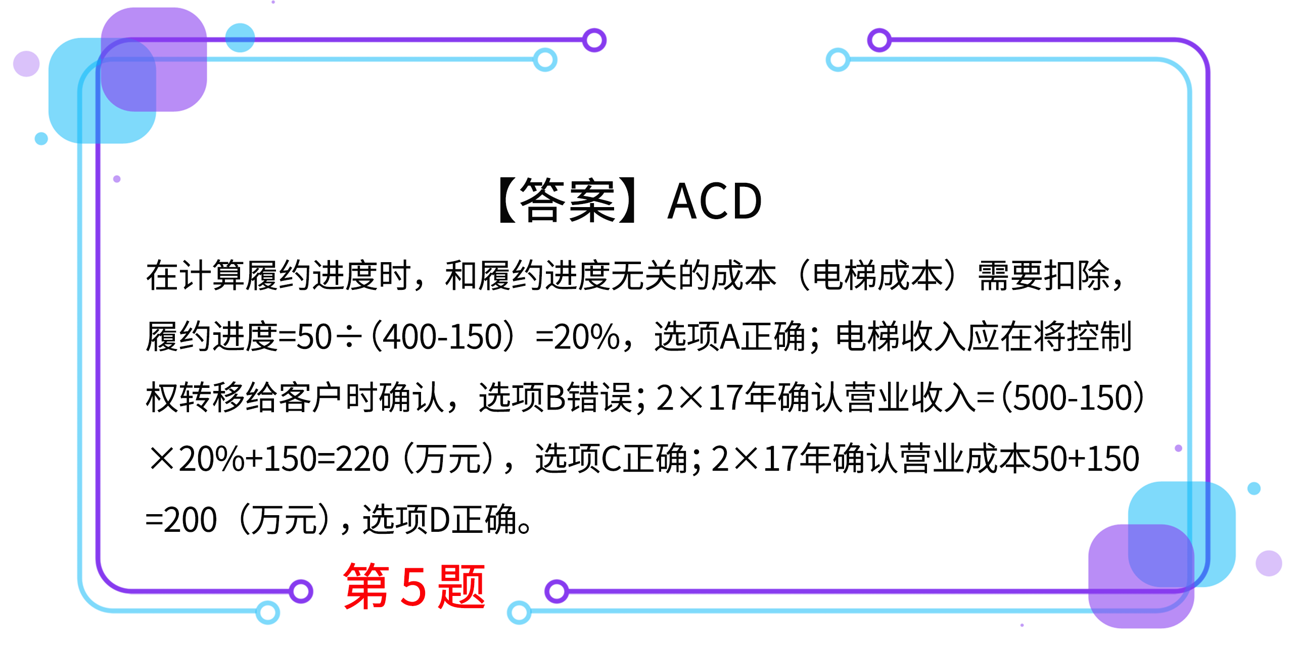 5.2×17年11月,甲公司與乙公司訂立一項(xiàng)裝修一幢3層建筑并安裝新電梯的合同,合同總對(duì)價(jià)為500萬(wàn)元。已承諾的裝修服務(wù)(包括電梯安裝,假定電梯毛利為0)是一項(xiàng)在一段時(shí)間內(nèi)履行的履約義務(wù)。預(yù)計(jì)總成本為400萬(wàn)元(包括電梯成本150萬(wàn)元)。甲公司在電梯轉(zhuǎn)讓給乙公司前獲得對(duì)電梯的控制。甲公司使用投入法基于已發(fā)生的成本來(lái)計(jì)量其履約義務(wù)的履約進(jìn)度。乙公司在2×17年12月電梯運(yùn)抵該建筑物時(shí)獲得對(duì)電梯的控制,電梯直至2×18年6月才安裝完成。甲公司未參與電梯的設(shè)計(jì)與安裝。至2×17年12月31日,已發(fā)生的成本為50萬(wàn)元(不包括電梯)。下列會(huì)計(jì)處理表述中,正確的有( )。