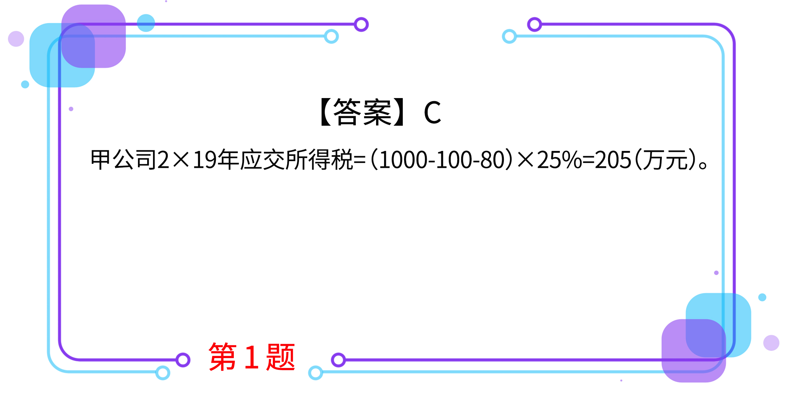 2.甲公司適用的企業(yè)所得稅稅率為25%。20×9年6月30日,甲公司以3000萬元(不含增值稅)的價格購入一套環(huán)境保護專用設備,并于當月投入使用。按照企業(yè)所得稅法的相關規(guī)定,甲公司對上述環(huán)境保護專用設備投資額的10%可以從當年應納稅額中抵免,當年不足抵免的,可以在以后5個納稅年度抵免。20×9年度,甲公司實現(xiàn)利潤總額1000萬元。假定甲公司未來5年很可能獲得足夠的應納稅所得額用來抵扣可抵扣虧損和稅款抵減。不考慮其他因素,甲公司在20×9年度利潤表中應當列報的所得稅費用金額是( )。(2019年回憶版)