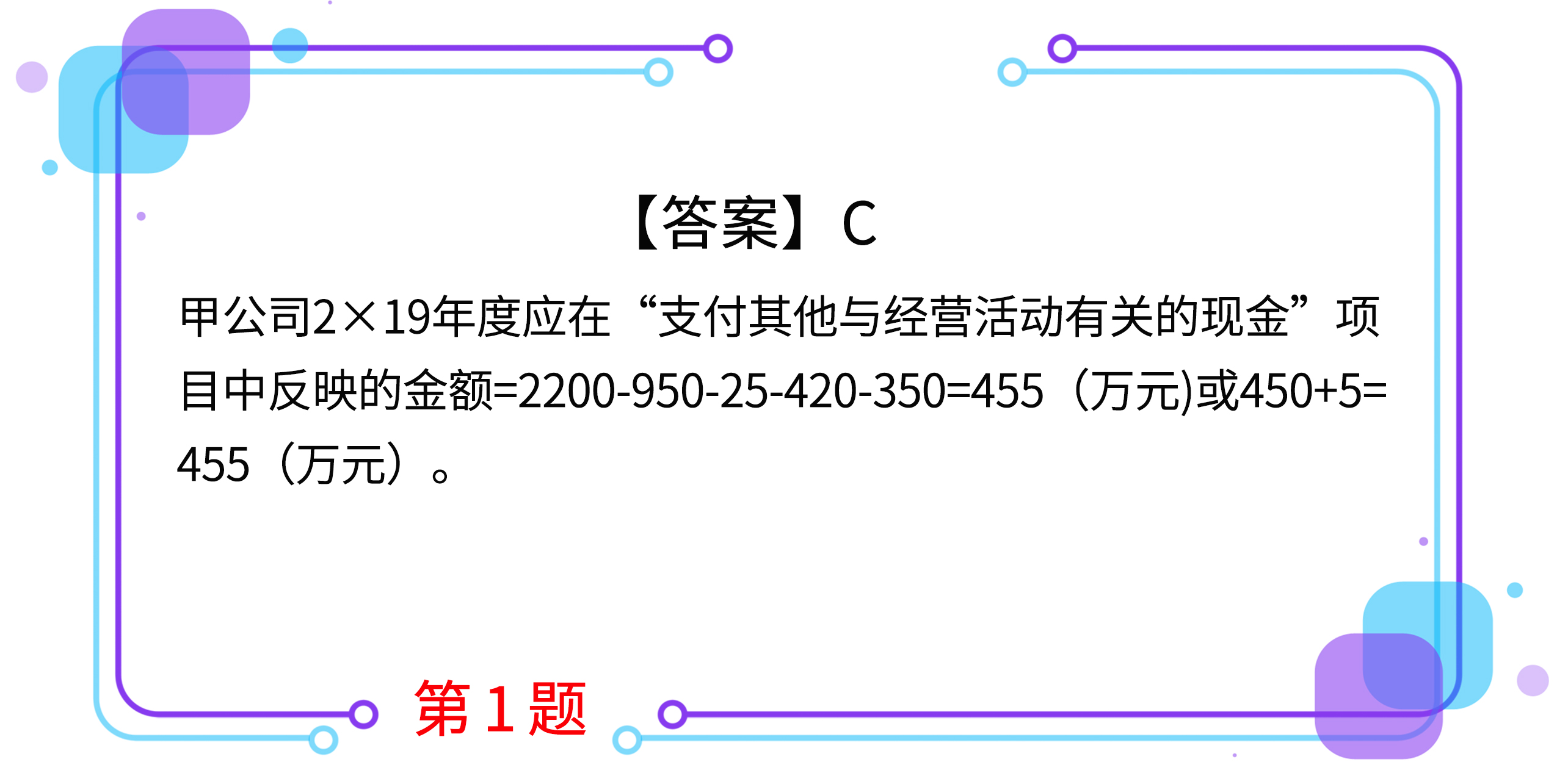 1.甲公司2×19年度發(fā)生的管理費(fèi)用為2200萬元,其中:以現(xiàn)金支付退休職工統(tǒng)籌退休金450萬元和管理人員工資950萬元,存貨盤虧損失25萬元,計(jì)提固定資產(chǎn)折舊420萬元,計(jì)提無形資產(chǎn)攤銷350萬元,以現(xiàn)金支付保險(xiǎn)費(fèi)5萬元。甲公司2×19年度應(yīng)在“支付其他與經(jīng)營活動有關(guān)的現(xiàn)金”項(xiàng)目中反映的金額為( )萬元。