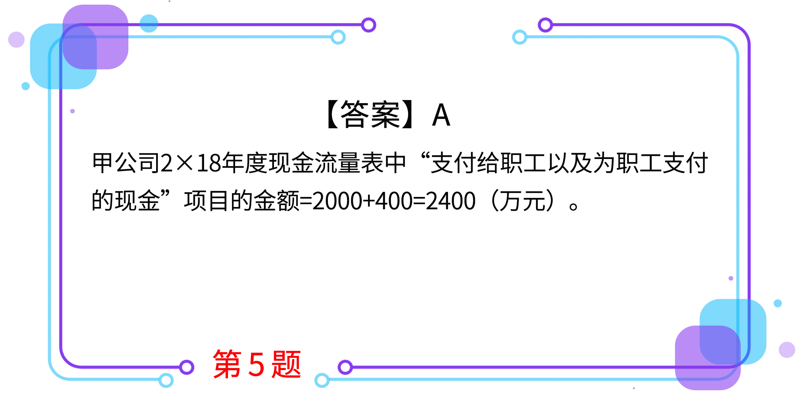 5.甲公司2×18年年初資產(chǎn)負(fù)債表“應(yīng)付職工薪酬”項(xiàng)目金額為200萬元,本年度以銀行存款共支付職工薪酬2000萬元,另支付繳納住房公積金、養(yǎng)老保險(xiǎn)金等400萬元,將2×17年購入的價款為100萬元(不含增值稅)的商品發(fā)放給職工作為非貨幣性福利,該外購商品款項(xiàng)117萬元(含增值稅)已于2×17年支付,本年度計(jì)入各項(xiàng)成本與費(fèi)用的應(yīng)付職工薪酬共計(jì)3000萬元。甲公司無在建工程人員及離退休人員。甲公司2×18年度現(xiàn)金流量表中“支付給職工以及為職工支付的現(xiàn)金”項(xiàng)目的金額為( )萬元。