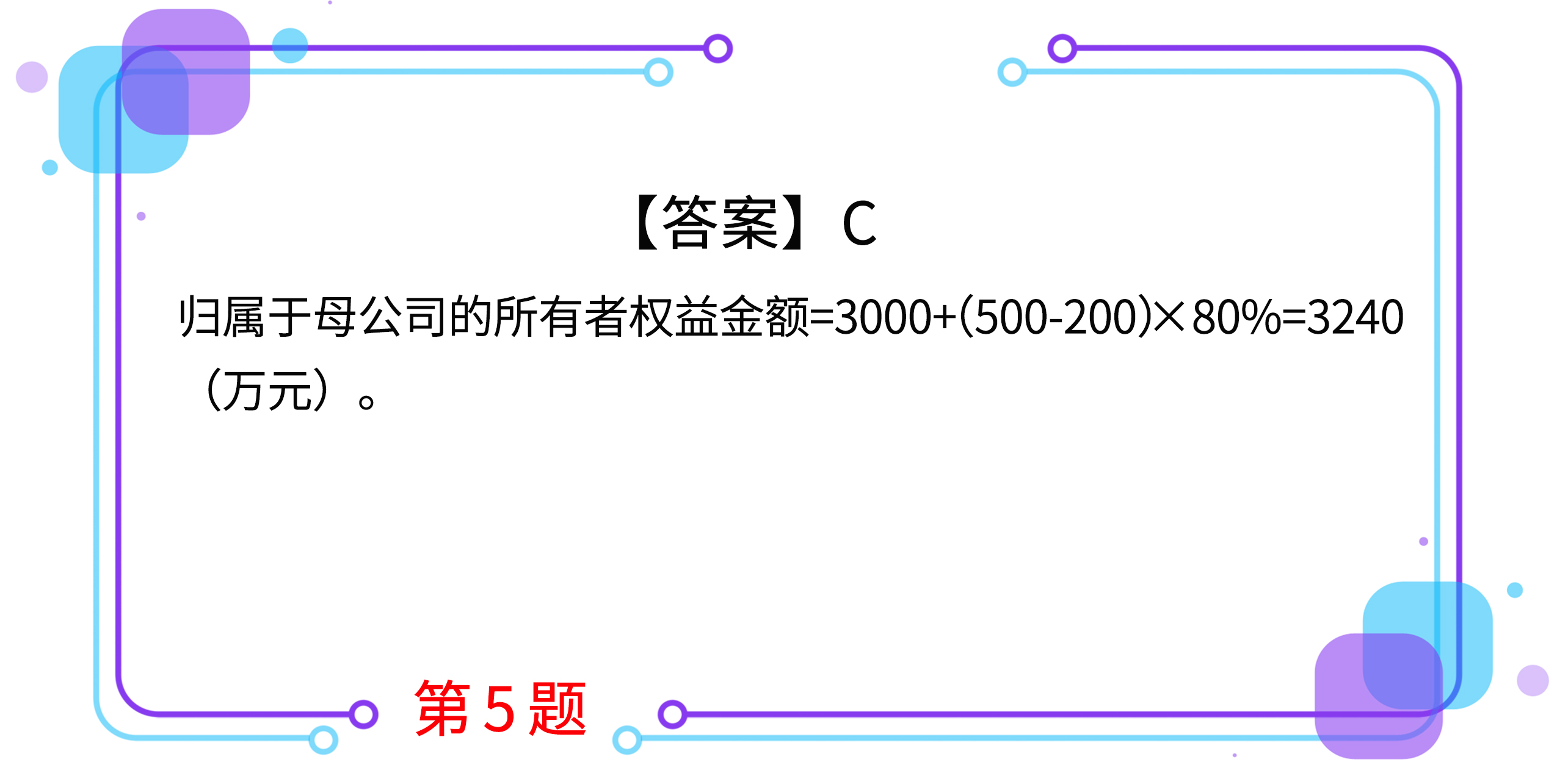 5.2×19年1月1日,甲公司從集團外部購入乙公司80%有表決權的股份,構成了非同一控制下企業(yè)合并。2×19年度,乙公司實現(xiàn)凈利潤600萬元,乙公司按購買日公允價值持續(xù)計算的凈利潤為500萬元,分派現(xiàn)金股利200萬元。2×19年12月31日,甲公司個別資產負債表中所有者權益總額為3000萬元,不考慮其他因素,甲公司2×19年12月31日合并資產負債表中歸屬于母公司所有者權益的金額為( )萬元。