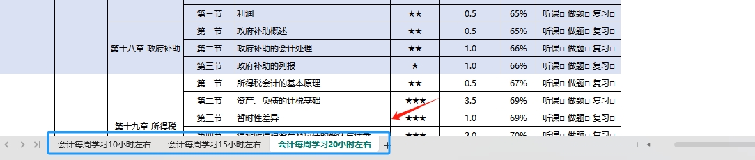打開一份學習計劃表,在電腦屏幕的左下方位置,可以看到學習計劃表根據(jù)每周學習該科目的時長劃分為三種情況,分別為“會計每周學習10小時左右”、“會計每周學習15小時左右”和“會計每周學習20小時左右”,考生請根據(jù)自身實際情況,選擇對應表格。點擊下方圖片查看大圖!