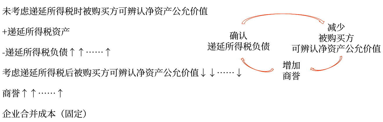 (1)非同一控制下免稅的吸收合并,若被購買方資產(不包括商譽)、負債的賬面價值與計稅基礎不同,確認遞延所得稅資產或負債時影響商譽;