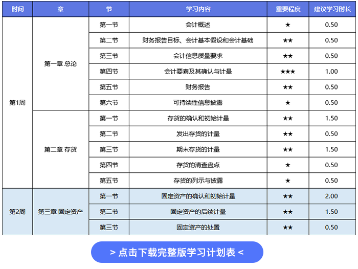 《會計(jì)》預(yù)習(xí)階段學(xué)習(xí)計(jì)劃表不僅細(xì)致規(guī)劃每周學(xué)習(xí)安排,還貼心標(biāo)注各節(jié)重要程度與建議學(xué)習(xí)時(shí)長,便于考生合理分配備考時(shí)間。并且計(jì)劃表較為靈活,備考起始時(shí)間可自行設(shè)定。點(diǎn)擊下方圖片,即可下載完整版學(xué)習(xí)計(jì)劃!