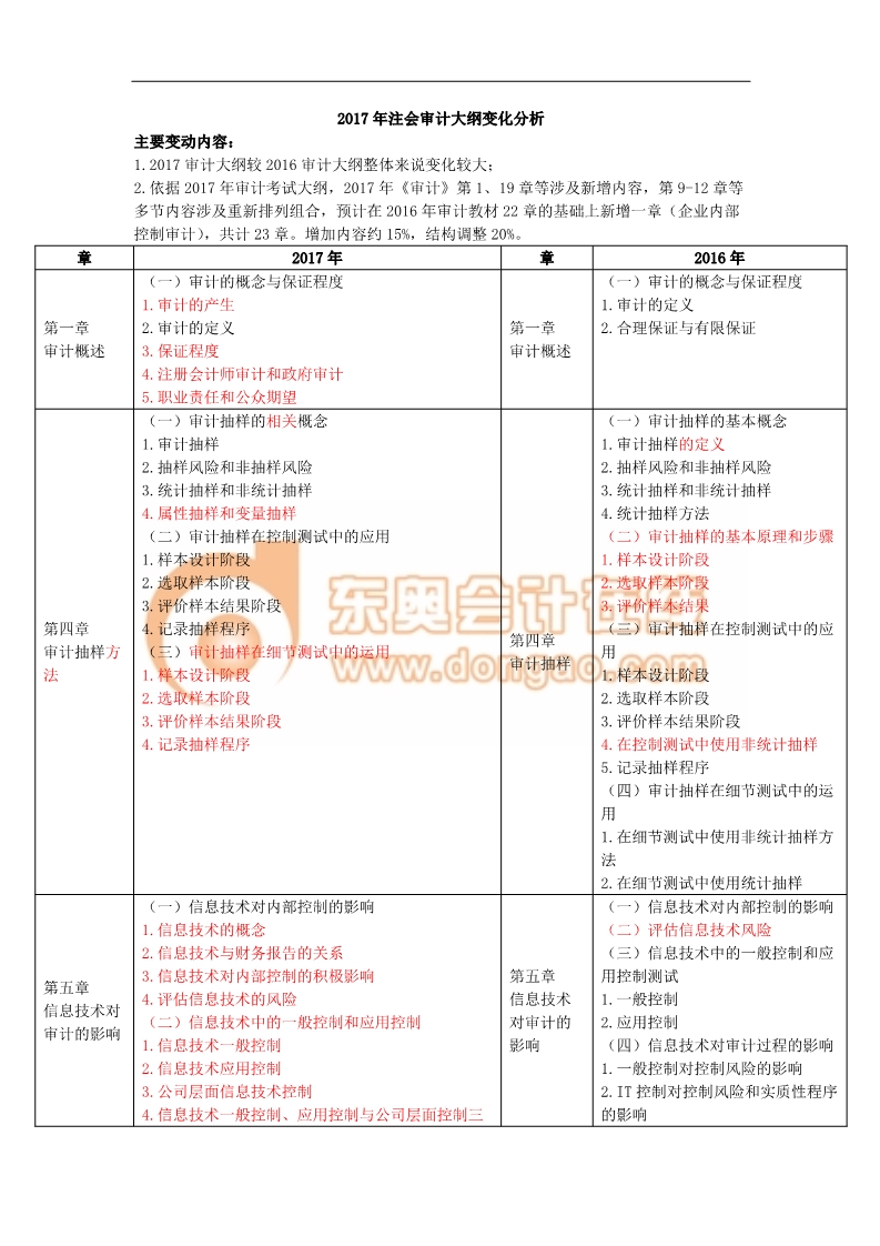 2017年注冊會計師考試大綱已經(jīng)公布,東奧老師對2017年與2016年注會《審計》考試大綱變化進行了對比分析,希望大家及時了解注會大綱變化情況。