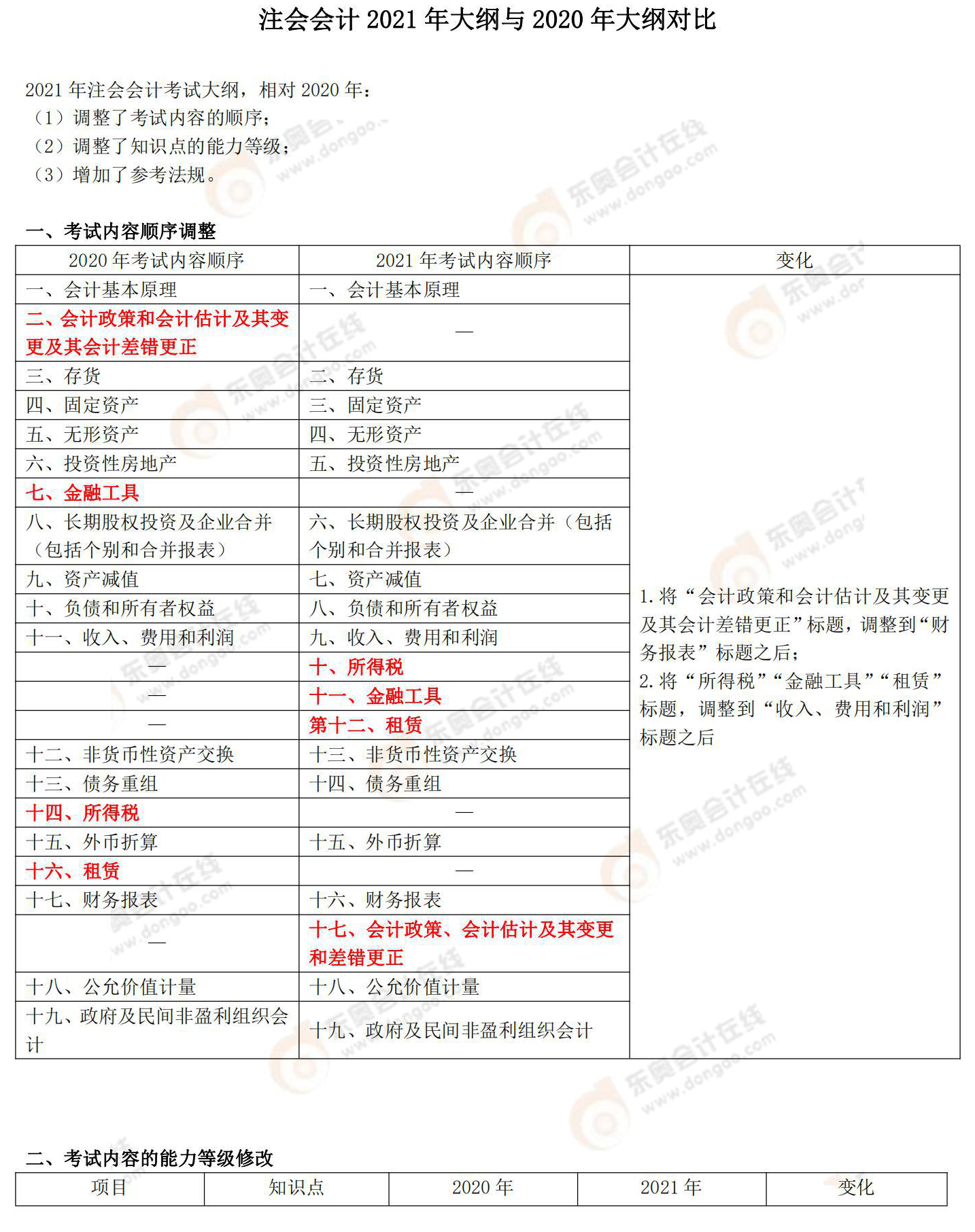 注會考試大綱是考生備考必不可少的學(xué)習(xí)資料之一,2021年注會考試大綱已經(jīng)公布,今年的考綱發(fā)生了哪些變化呢?東奧小編為大家整理了各科目考綱變化對比,快來了解一下吧!