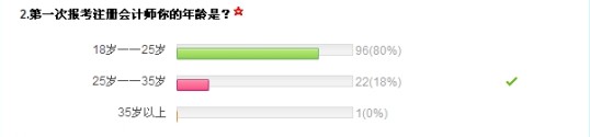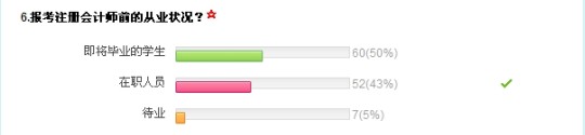 據(jù)調(diào)查顯示,首次報考注會的考生約有80%集中在18歲到25歲,25歲到35歲的占到約20%。即將畢業(yè)的大學(xué)應(yīng)屆生占到50%,在職人員占43%,待業(yè)人員的占約5%。