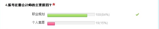 報告中顯示,約有84%的考生考注會是為了實現(xiàn)自己人生規(guī)劃,占絕大多數(shù),剩下的16%考注會是自己的個人意愿。我們考注會的最終目的,不單單是通過考試那么簡單,我們是為了改善自己的現(xiàn)狀,追求自己的理想,實現(xiàn)自己的人生價值,考到證以后運用它實現(xiàn)自身利益才是所有人都想要的。