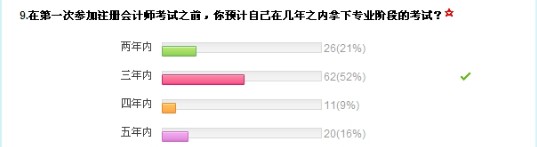 據(jù)調(diào)查顯示,預(yù)計兩年內(nèi)通過考試的占21%,三年內(nèi)通過考試的占52%,四年內(nèi)通過考試的占9%,五年內(nèi)通過考試的占16%。計劃在三年內(nèi)通過考試的人數(shù)占一半,那么平均每年就得通過兩科,計劃兩年內(nèi)容通過專業(yè)階段考試的也有一定比例,那么平均每年就得通過三門考試。