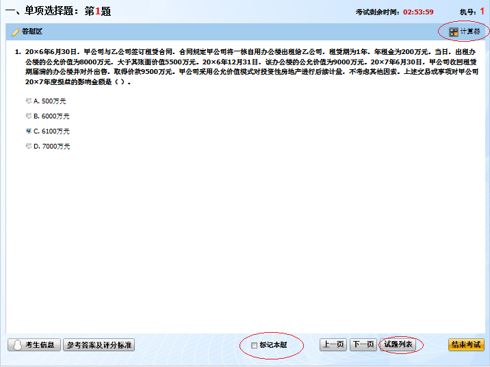 客觀題也會有大量計算,有三種計算器供考生們選擇,分別是:機考系統(tǒng)中的計算器(下圖右上角)、Windows系統(tǒng)可調(diào)用的計算器、自行攜帶的計算器。其中機考系統(tǒng)中的計算器功能最為簡單,只能進行簡單的四則運算,但應(yīng)付考試中的計算題已足夠;Windows系統(tǒng)可調(diào)用的計算器功能最為強大;如果習(xí)慣手打,用自己攜帶的計算器也可以。無論選用哪一種計算器,最好在練習(xí)之初就確定下來,以方便今后常聯(lián)系,熟能生巧。