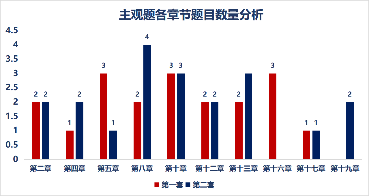 兩套試卷中,第一章、第三章、第六章、第七章、第九章、第十一章、第十四章、第十五章、第十八章、第二十章、第二十一章均沒有出題;主觀題考點主要集中在第五章、第八章、第十章、第十三章。其中,只有第二套試卷考查了第十九章的內(nèi)容。