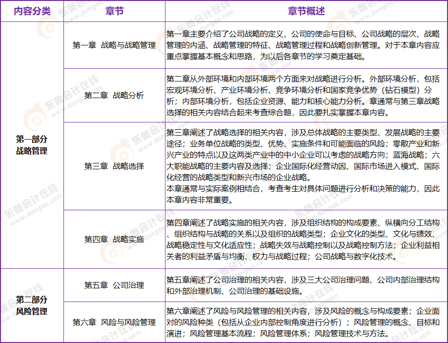 與其他科目相比,戰(zhàn)略的章節(jié)數(shù)較少,僅有6章。這6章可以分為兩個部分,第一章至第四章為一部分,主要講述與戰(zhàn)略管理相關的內容。第二部分為第五章和第六章,主要講述風險管理相關內容。