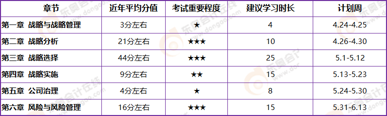 戰(zhàn)略科目的章節(jié)數(shù)雖然并不多,但是想要學完教材上的內容也需要一段時間。其中第二章、第三章、第四章、第六章的內容更為重要,預計要花費65個小時進行學習。考生們可以根據(jù)章節(jié)的重要程度及自己的實際情況合理安排備考時間。為了幫助大家高效備考,東奧小編也根據(jù)田明老師的基礎班課程整理了戰(zhàn)略科目的重要知識點,考生們別錯過哦!