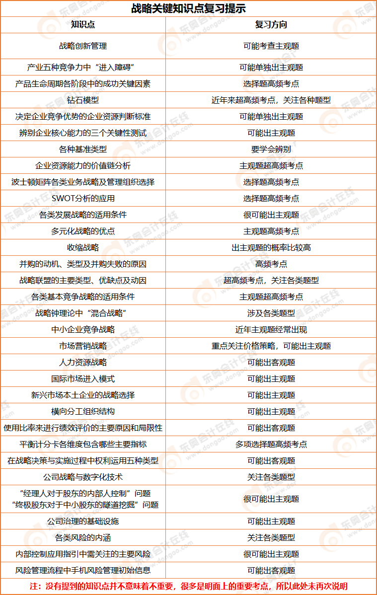 注會考試中,戰(zhàn)略科目需要記憶的內(nèi)容較多!而且今年教材的變化相對較大,考生們?nèi)绾斡兄攸c的進行復習呢?東奧小編為大家整理了除常規(guī)重要知識點外的其他關(guān)鍵知識點以及可能考查的形式,考生們可以有針對性的進行復習!