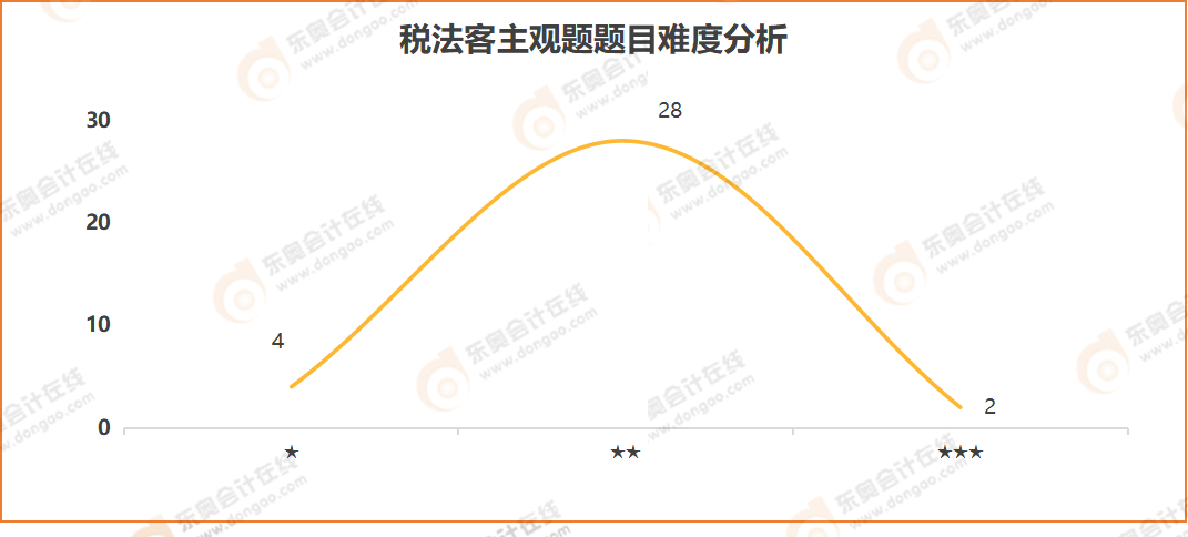 在稅法考試中,主觀題考試以二星難度考題為主,其中二星難度考題為28道,一星難度考題與三星難度考題分別為4道、2道。