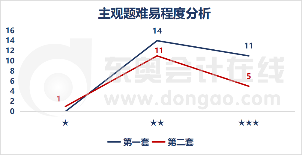 兩個(gè)批次的考試中,未出現(xiàn)1星難度題目,考題主要集中在2星和3星難度。其中,第一批次考試中的2星難度考題為6道,第二批次為5道;3星難度考題第一批次為8道,第二批次為9道??傮w來看,主觀題考查難度要大于客觀題。