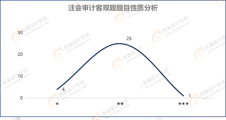 在注會(huì)審計(jì)考試中,客觀題共計(jì)35小題。東奧根據(jù)考生的回憶整理出了30道試題,并進(jìn)行了詳細(xì)的分析!在30道客觀題中,二星難度考題占比較高,共計(jì)25道,1星考題共有,4道,2星考題僅有1道。