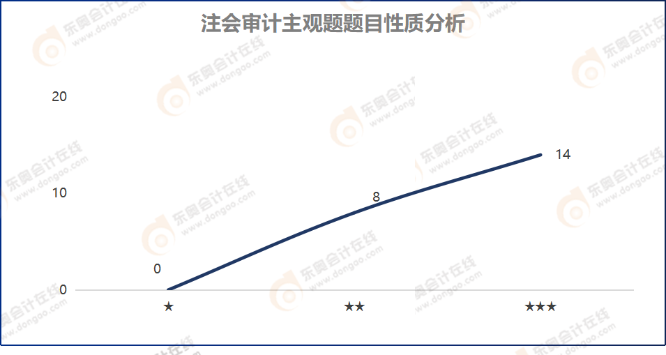 審計考試主觀題共計7道,東奧根據(jù)考生提供的信息整理出了6道題目,共計22小問。在22小問中,以二星和三星的難度考題為主,未出現(xiàn)一星難度的考試題目。