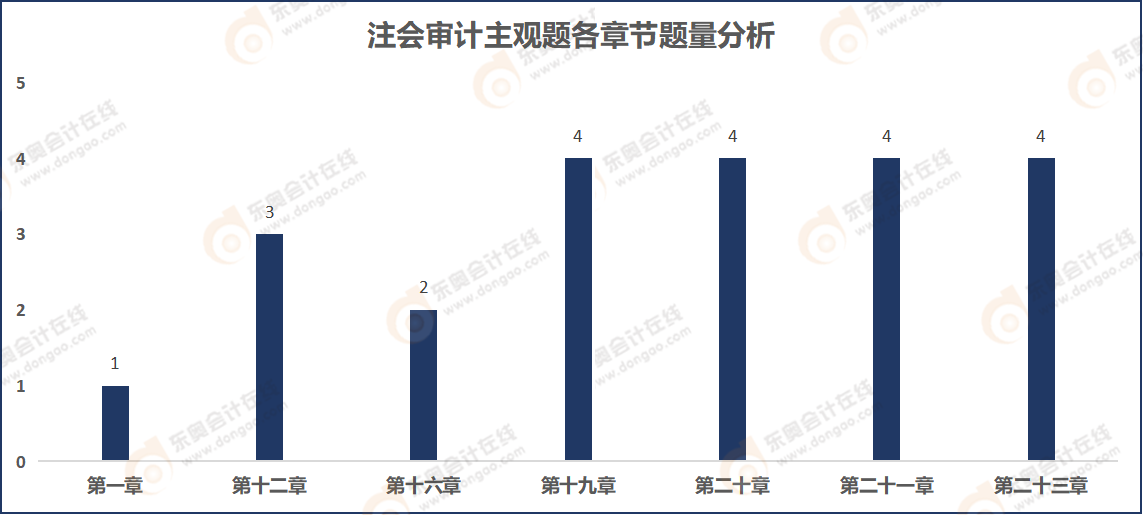 注會審計考試中,主觀題考查的章節(jié)較為集中。在整理出的題目中,涉及到了第一章、第十二章、第十六章、第十九章、第二十章、第二十一章、第二十三章的相關(guān)內(nèi)容。其中,第十九章、第二十章、第二十一章、第二十三章題目數(shù)量均為4道。