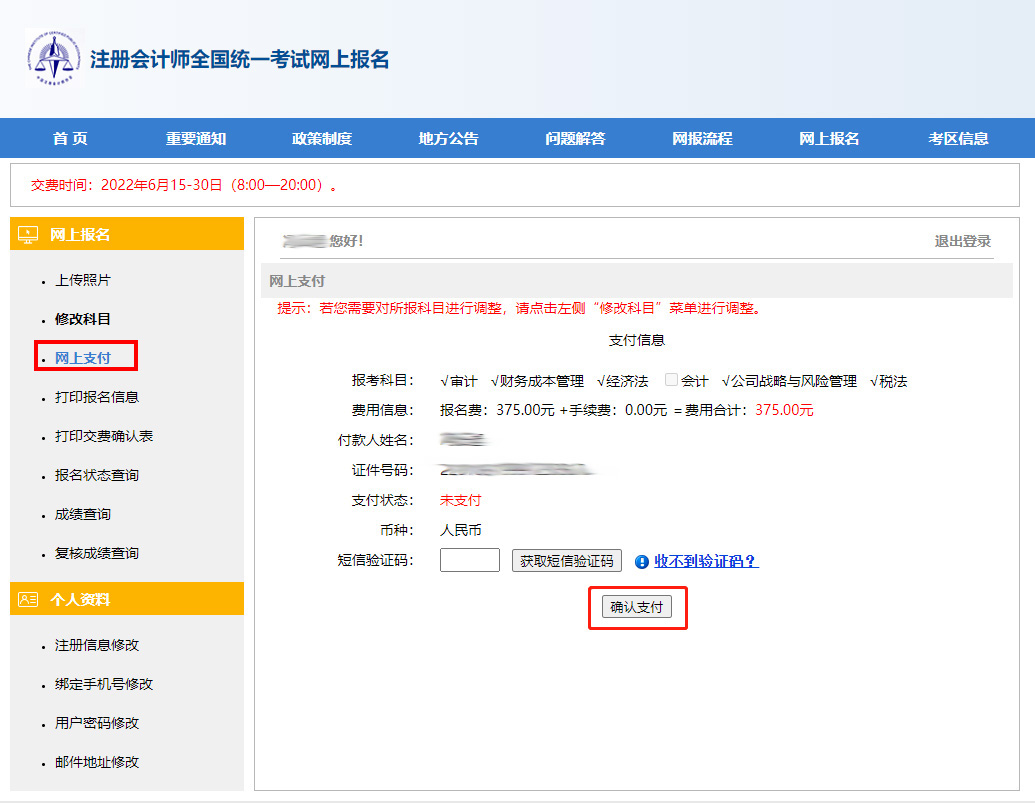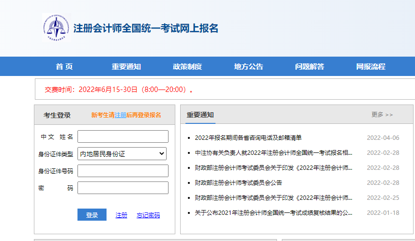 已經(jīng)于4月份完成注會報名信息填報的考生,需要在6月15日—30日每天的8:00-20:00登錄注冊會計師考試網(wǎng)上報名系統(tǒng)進行繳費。注:未報名不可以進行繳費。繳費步驟如下: