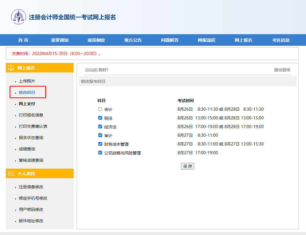 PC端成功登錄后點擊頁面左側(cè)的“修改科目”選項。結(jié)合備考情況,選擇準(zhǔn)備繳費科目,確定點擊“保存”。