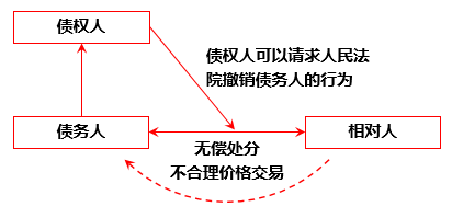 債務(wù)人以明顯不合理的低價(jià)轉(zhuǎn)讓財(cái)產(chǎn)、以明顯不合理的高價(jià)受讓他人財(cái)產(chǎn)或者為他人的債務(wù)提供擔(dān)保,影響債權(quán)人的債權(quán)實(shí)現(xiàn),債務(wù)人的相對(duì)人知道或者應(yīng)當(dāng)知道該情形的,債權(quán)人可以請(qǐng)求人民法院撤銷債務(wù)人的行為。