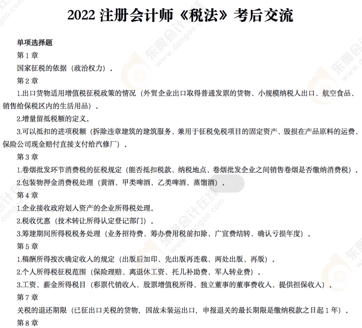 2022年注冊會計師稅法科目第一批次的考試終于結(jié)束了,考生們對考試中都考了哪些知識點十分好奇,尤其是對于還未參加考試的第二批次考試的考生以及延考考生來說,第一批次的考試考點十分具有參考意義。在東奧會計在線的直播活動中,各位考生與直播名師積極互動,反饋了很多在本批次考試中遇到的考點內(nèi)容。東奧會計在線為大家整理了文字版本的內(nèi)容,有需要的考生可以閱讀下文了解哦!點擊觀看完整直播>>>