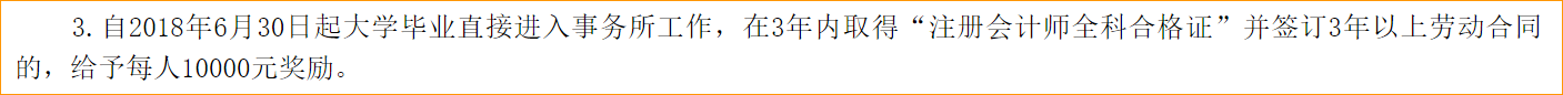 福利:在三年內(nèi)取得“注冊會計師全科合格證”并簽訂三年以上勞動合同的,給予每人10000元獎勵。