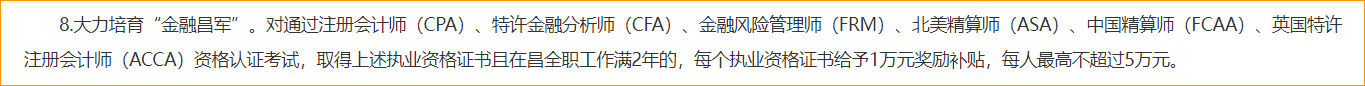福利:對通過注冊會計師(CPA)考試,取得執(zhí)業(yè)資格證書且在昌全職工作滿2年的,每個執(zhí)業(yè)資格證書給予1萬元獎勵補貼,每人不超過5萬元。