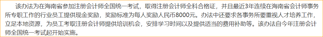 福利:取得注冊會計師全科合格證,并且最近3年連續(xù)在海南省會計師事務(wù)所專職工作的行業(yè)員工提供現(xiàn)金獎勵,獎勵標準為每人獎勵人民幣8000元。